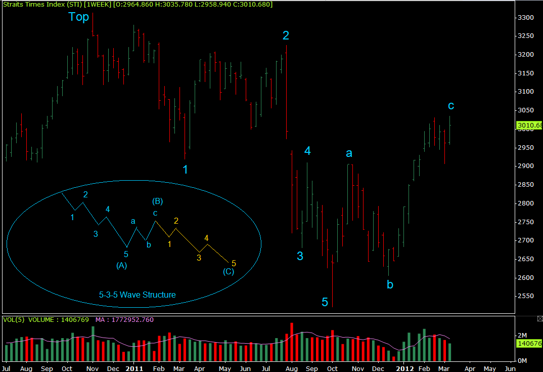 According to Elliott Wave International ( EWI ) March 15's report, the Elliott Wave count for the STI Weekly Chart is labeled in blue as below: