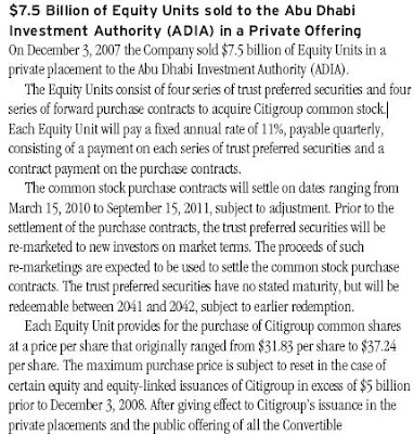 Our barber told us today that he recently bought 16 shares of Citigroup. He just said he felt inspired to buy Citigroup after watching their advertisements and that he just hope that this bank will not fail or else that chio eurasian girl he has been bioing would be out of job. We just love this barber for his cute way of thinking. Anyway, we decided to check it out. Let's use the GIC and Abu Dhabi Investment Authority (ADIA)'s investment as the basis of analysis, and not ratios, balance sheet, tier one ratio and stuff.