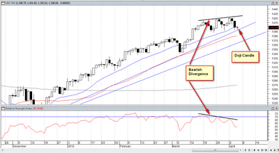 RSI Bearish Divergence On Major Indices  Both DJIA and S& P500 closed with a doji at evening star position after touching trendline support. This may signal the end of a three days loosing streak for the US indices ( evening star doji is a 3-day pattern so confirmation is needed on Monday ).
